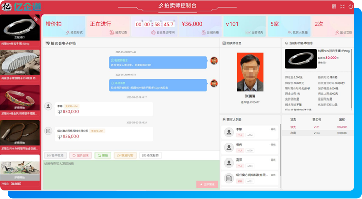 線上客戶可通過競拍系統出價,現場客戶可由記錄員代為出價。對于全是現場客戶的情況,億企拍也可作為競拍全流程電子檔案。